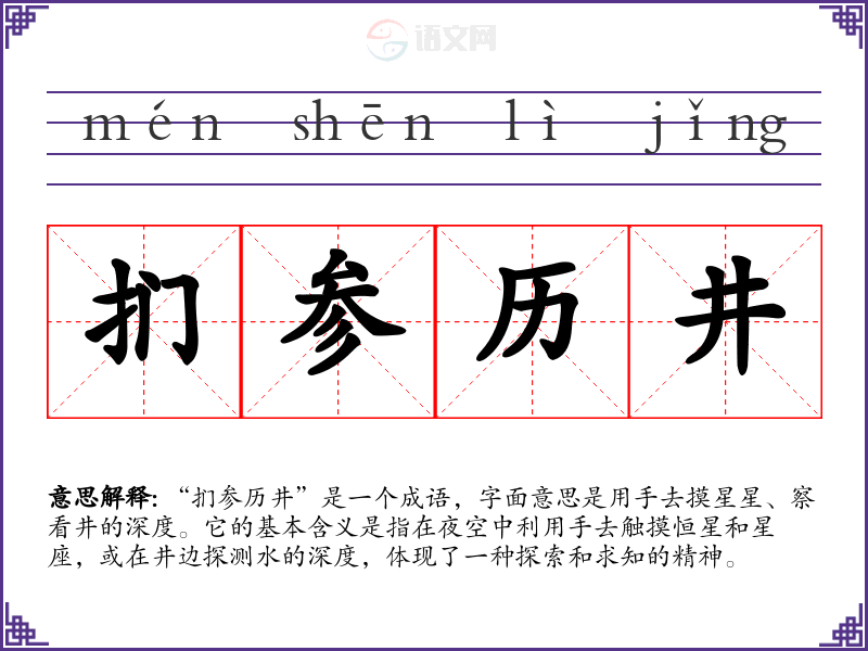 “扪参历井”是一个成语,字面意思是用手去摸星星、察看井的深度。它的基本含义是指在夜空中利用手去触摸恒星和星座,或在井边探测水的深度,体现了一种探索和求知的精神。