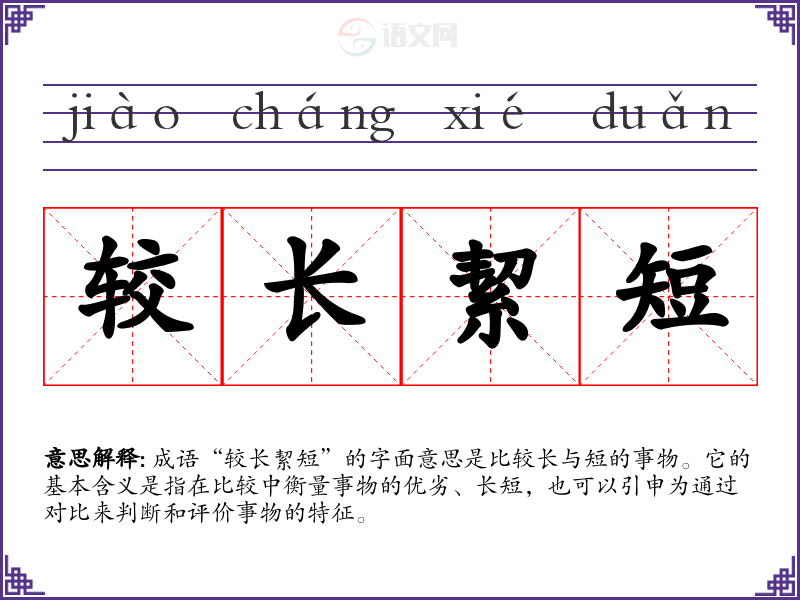 成语“较长絜短”的字面意思是比较长与短的事物。它的基本含义是指在比较中衡量事物的优劣、长短,也可以引申为通过对比来判断和评价事物的特征。