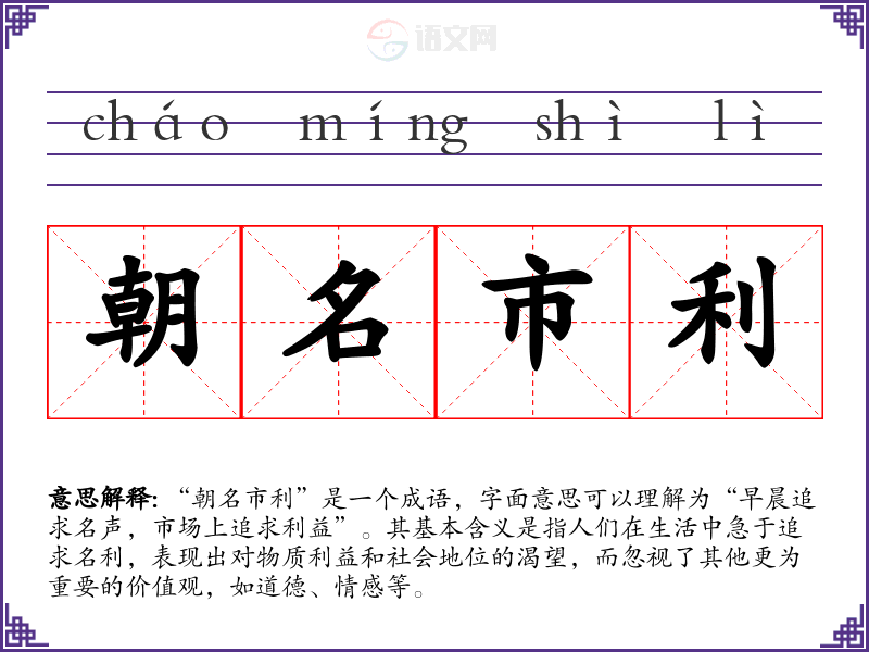 “朝名市利”是一个成语,字面意思可以理解为“早晨追求名声,市场上追求利益”。其基本含义是指人们在生活中急于追求名利,表现出对物质利益和社会地位的渴望,而忽视了其他更为重要的价值观,如道德、情感等。