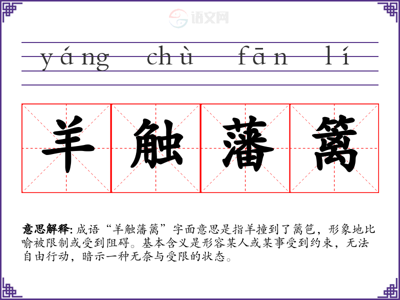 成语“羊触藩篱”字面意思是指羊撞到了篱笆,形象地比喻被限制或受到阻碍。基本含义是形容某人或某事受到约束,无法自由行动,暗示一种无奈与受限的状态。