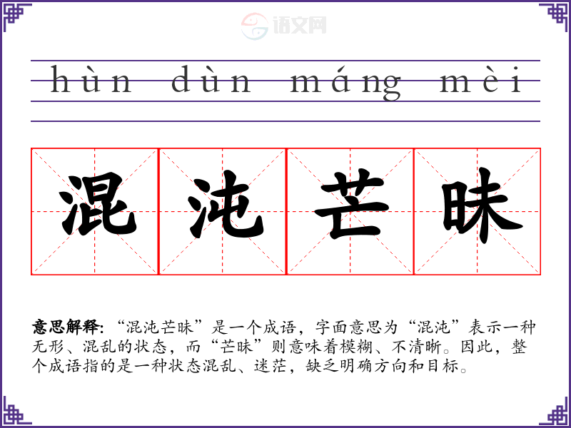 “混沌芒昧”是一个成语,字面意思为“混沌”表示一种无形、混乱的状态,而“芒昧”则意味着模糊、不清晰。因此,整个成语指的是一种状态混乱、迷茫,缺乏明确方向和目标。