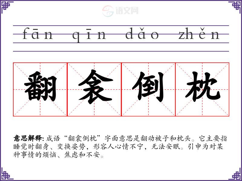 成语“翻衾倒枕”字面意思是翻动被子和枕头。它主要指睡觉时翻身、变换姿势,形容人心情不宁,无法安眠。引申为对某种事情的烦恼、焦虑和不安。
