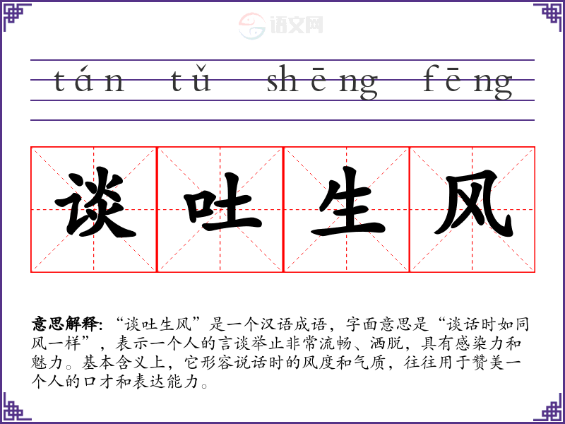 “谈吐生风”是一个汉语成语,字面意思是“谈话时如同风一样”,表示一个人的言谈举止非常流畅、洒脱,具有感染力和魅力。基本含义上,它形容说话时的风度和气质,往往用于赞美一个人的口才和表达能力。