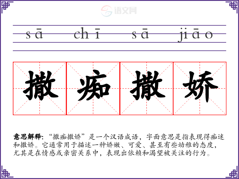 “撒痴撒娇”是一个汉语成语,字面意思是指表现得痴迷和撒娇。它通常用于描述一种娇嫩、可爱、甚至有些幼稚的态度,尤其是在情感或亲密关系中,表现出依赖和渴望被关注的行为。