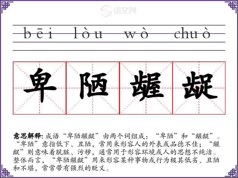 成语“卑陋龌龊”由两个词组成:“卑陋”和“龌龊”。“卑陋”意指低下、丑陋,常用来形容人的外表或品德不佳;“龌龊”则意味着肮脏、污秽,通常用于形容环境或人的思想不纯洁。整体而言,“卑陋龌龊”用来形容某种事物或行为极其低劣、丑陋和不堪,常常带有强烈的贬义。