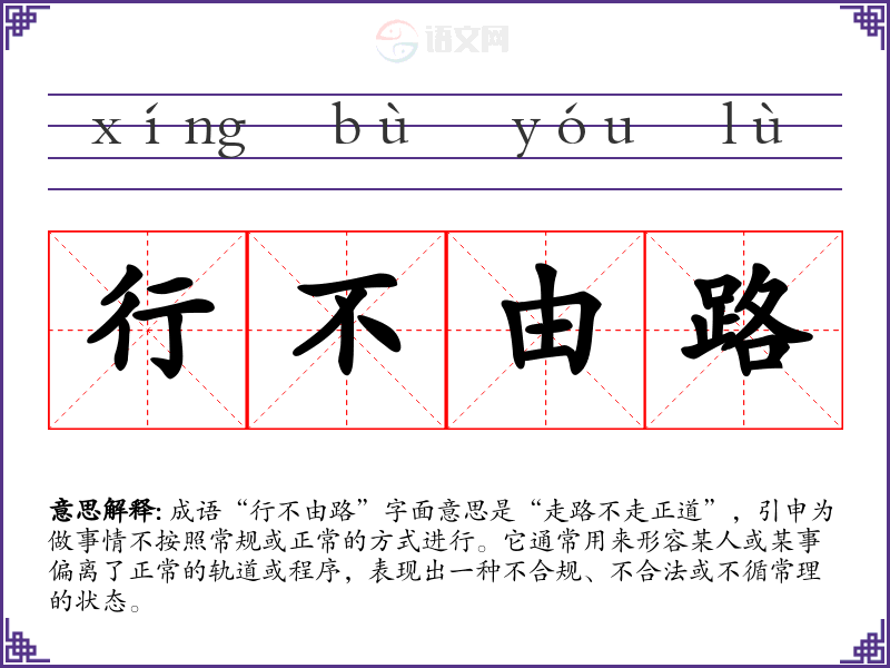成语“行不由路”字面意思是“走路不走正道”,引申为做事情不按照常规或正常的方式进行。它通常用来形容某人或某事偏离了正常的轨道或程序,表现出一种不合规、不合法或不循常理的状态。