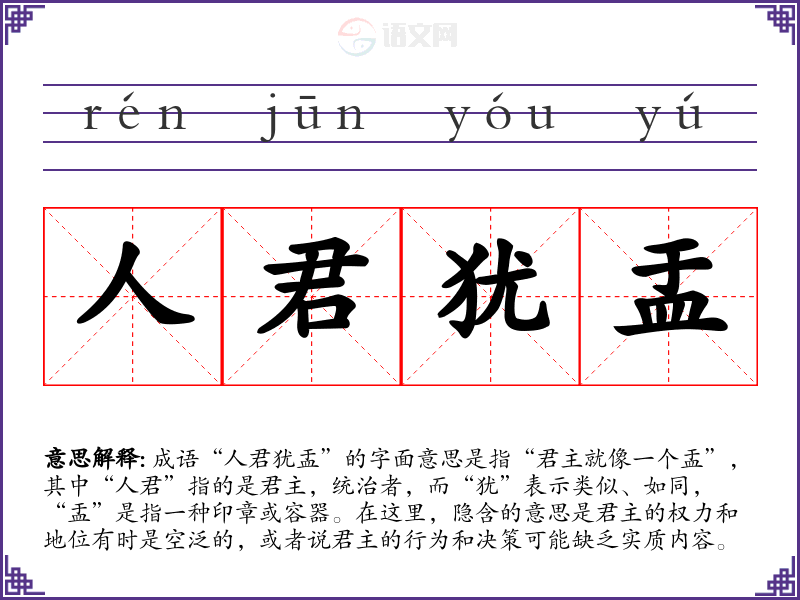 成语“人君犹盂”的字面意思是指“君主就像一个盂”,其中“人君”指的是君主,统治者,而“犹”表示类似、如同,“盂”是指一种印章或容器。在这里,隐含的意思是君主的权力和地位有时是空泛的,或者说君主的行为和决策可能缺乏实质内容。