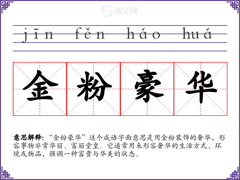 “金粉豪华”这个成语字面意思是用金粉装饰的奢华,形容事物非常华丽、富丽堂皇。它通常用来形容奢华的生活方式、环境或物品,强调一种富贵与华美的状态。