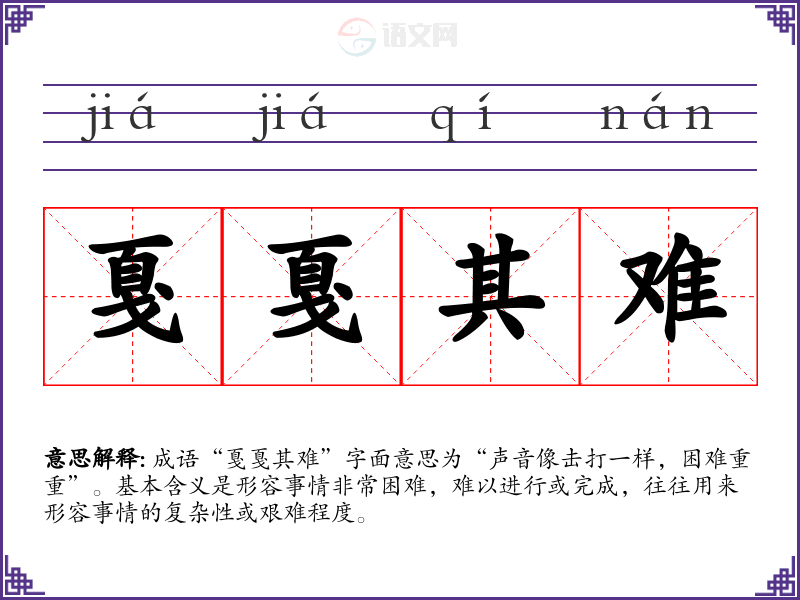 成语“戛戛其难”字面意思为“声音像击打一样,困难重重”。基本含义是形容事情非常困难,难以进行或完成,往往用来形容事情的复杂性或艰难程度。
