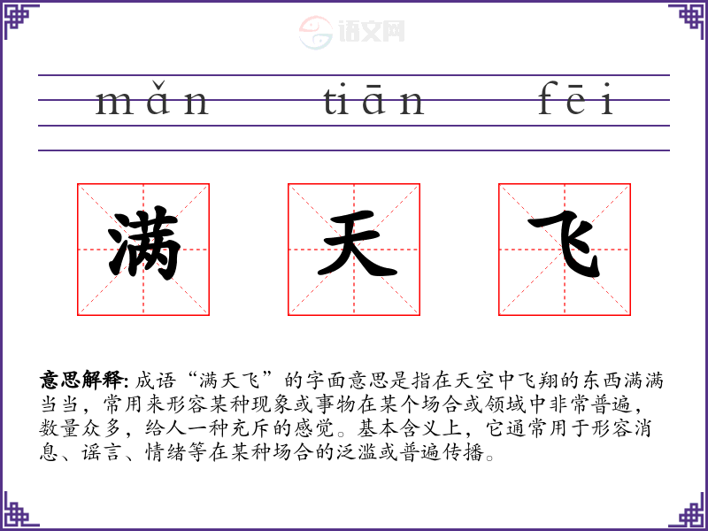 “满天飞”并没有明确的历史典故或文学出处,其构成由“满”和“天飞”两个部分组成,形象地表达了事物在空中飞舞,覆盖广泛的状态。这个成语的形成可能与古代对自然现象的观察有关,尤其是在形容某些事物的数量时,常使用“满天”来强调其普及程度。