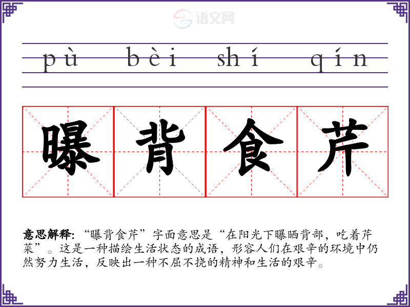 “曝背食芹”字面意思是“在阳光下曝晒背部,吃着芹菜”。这是一种描绘生活状态的成语,形容人们在艰辛的环境中仍然努力生活,反映出一种不屈不挠的精神和生活的艰辛。