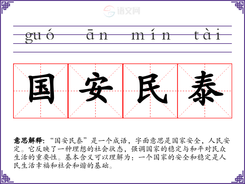“国安民泰”是一个成语,字面意思是国家安全,人民安定。它反映了一种理想的社会状态,强调国家的稳定与和平对民众生活的重要性。基本含义可以理解为:一个国家的安全和稳定是人民生活幸福和社会和谐的基础。