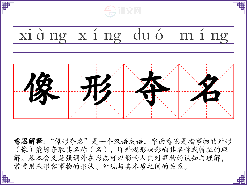“像形夺名”是一个汉语成语,字面意思是指事物的外形(像)能够夺取其名称(名),即外观形状影响其名称或特征的理解。基本含义是强调外在形态可以影响人们对事物的认知与理解,常常用来形容事物的形状、外观与其本质之间的关系。