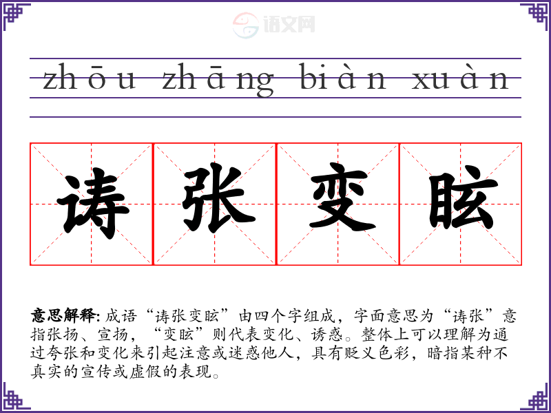 成语“诪张变眩”由四个字组成,字面意思为“诪张”意指张扬、宣扬,“变眩”则代表变化、诱惑。整体上可以理解为通过夸张和变化来引起注意或迷惑他人,具有贬义色彩,暗指某种不真实的宣传或虚假的表现。