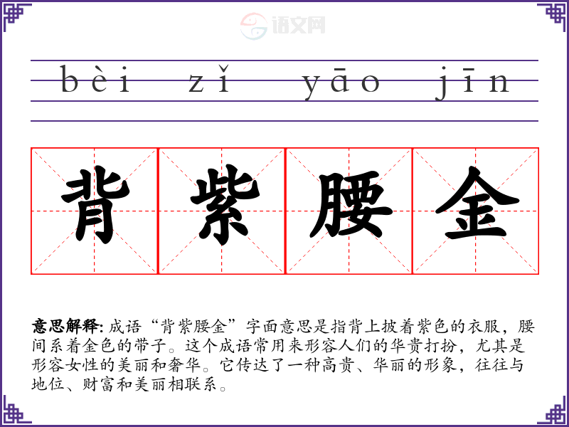 成语“背紫腰金”字面意思是指背上披着紫色的衣服,腰间系着金色的带子。这个成语常用来形容人们的华贵打扮,尤其是形容女性的美丽和奢华。它传达了一种高贵、华丽的形象,往往与地位、财富和美丽相联系。