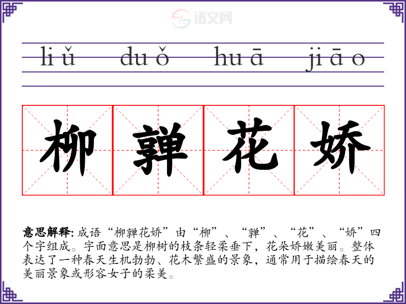成语“柳亸花娇”由“柳”、“亸”、“花”、“娇”四个字组成。字面意思是柳树的枝条轻柔垂下,花朵娇嫩美丽。整体表达了一种春天生机勃勃、花木繁盛的景象,通常用于描绘春天的美丽景象或形容女子的柔美。