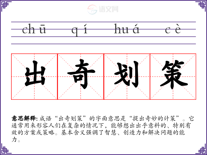 成语“出奇划策”的字面意思是“提出奇妙的计策”。它通常用来形容人们在复杂的情况下,能够想出出乎意料的、特别有效的方案或策略。基本含义强调了智慧、创造力和解决问题的能力。