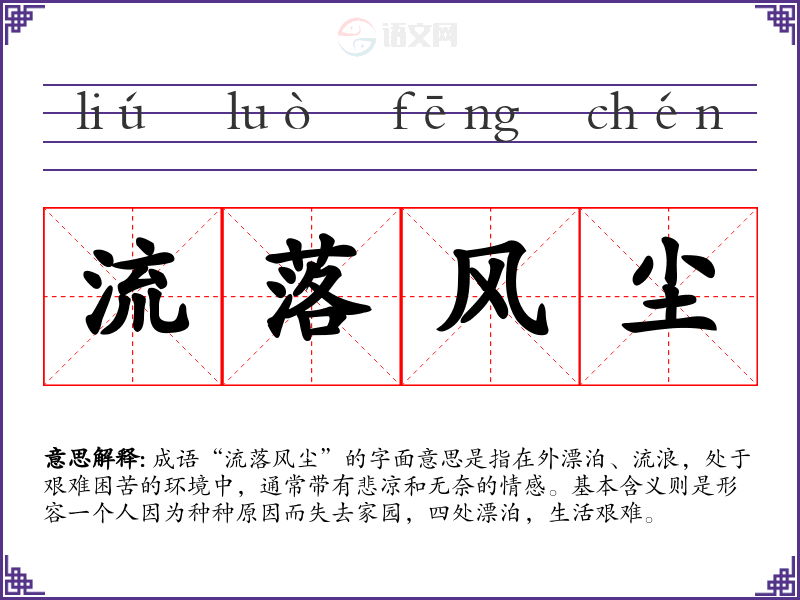 成语“流落风尘”的字面意思是指在外漂泊、流浪,处于艰难困苦的环境中,通常带有悲凉和无奈的情感。基本含义则是形容一个人因为种种原因而失去家园,四处漂泊,生活艰难。