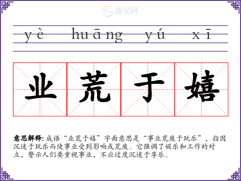 成语“业荒于嬉”字面意思是“事业荒废于玩乐”,指因沉迷于玩乐而使事业受到影响或荒废。它强调了娱乐和工作的对立,警示人们要重视事业,不应过度沉迷于享乐。