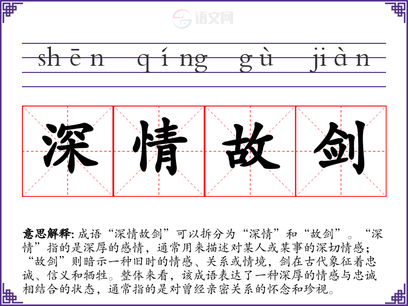 成语“深情故剑”可以拆分为“深情”和“故剑”。“深情”指的是深厚的感情,通常用来描述对某人或某事的深切情感;“故剑”则暗示一种旧时的情感、关系或情境,剑在古代象征着忠诚、信义和牺牲。整体来看,该成语表达了一种深厚的情感与忠诚相结合的状态,通常指的是对曾经亲密关系的怀念和珍视。