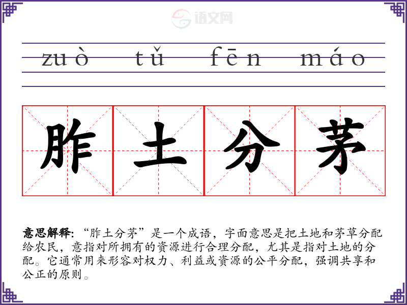 “胙土分茅”是一个成语,字面意思是把土地和茅草分配给农民,意指对所拥有的资源进行合理分配,尤其是指对土地的分配。它通常用来形容对权力、利益或资源的公平分配,强调共享和公正的原则。