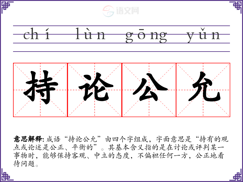 成语“持论公允”由四个字组成,字面意思是“持有的观点或论述是公正、平衡的”。其基本含义指的是在讨论或评判某一事物时,能够保持客观、中立的态度,不偏袒任何一方,公正地看待问题。