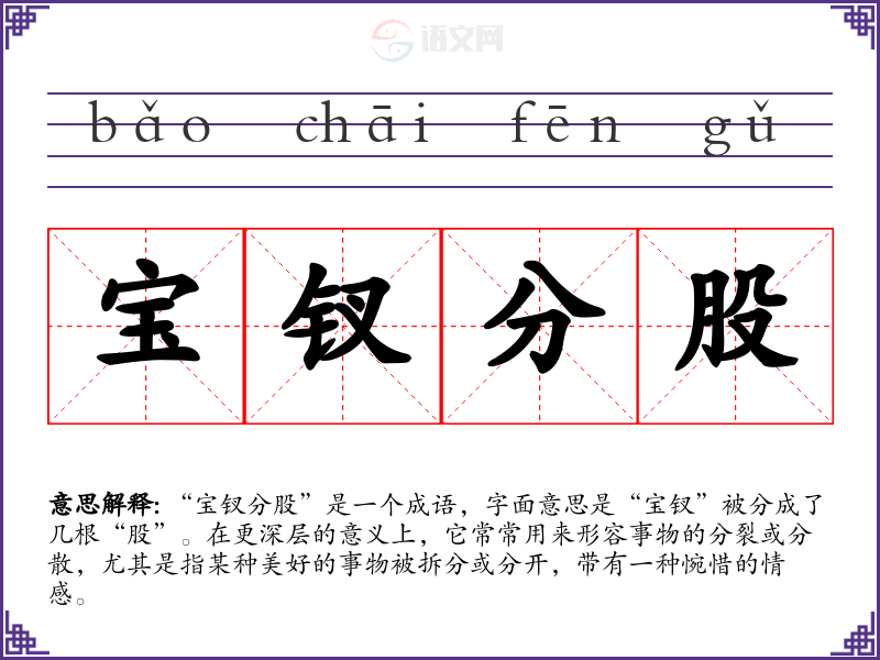 “宝钗分股”是一个成语,字面意思是“宝钗”被分成了几根“股”。在更深层的意义上,它常常用来形容事物的分裂或分散,尤其是指某种美好的事物被拆分或分开,带有一种惋惜的情感。