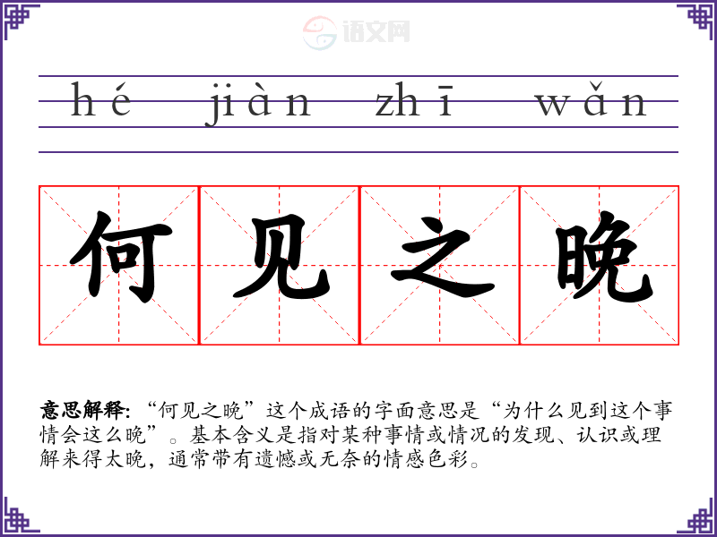 “何见之晚”并不是一个广为人知的成语,它的构成可以从字面理解为“何”为何,“见”为见到、认识,“之”为助词,“晚”指时间上的晚。可以推测这可能源于某些文学作品或古代典籍中对时机、见解的讨论,但具体的历史背景和典故并不明确。