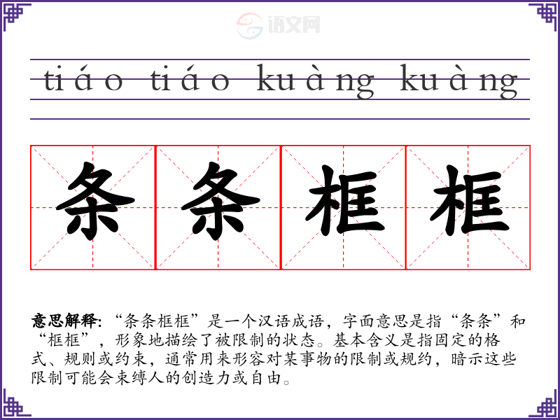 该成语的具体起源不详,但其构成的词汇“条”和“框”均为常见的汉字,分别指代线条和框架。成语的形成可能与传统文化中对规则和秩序的重视有关,反映了社会中对规范和约束的普遍认知。