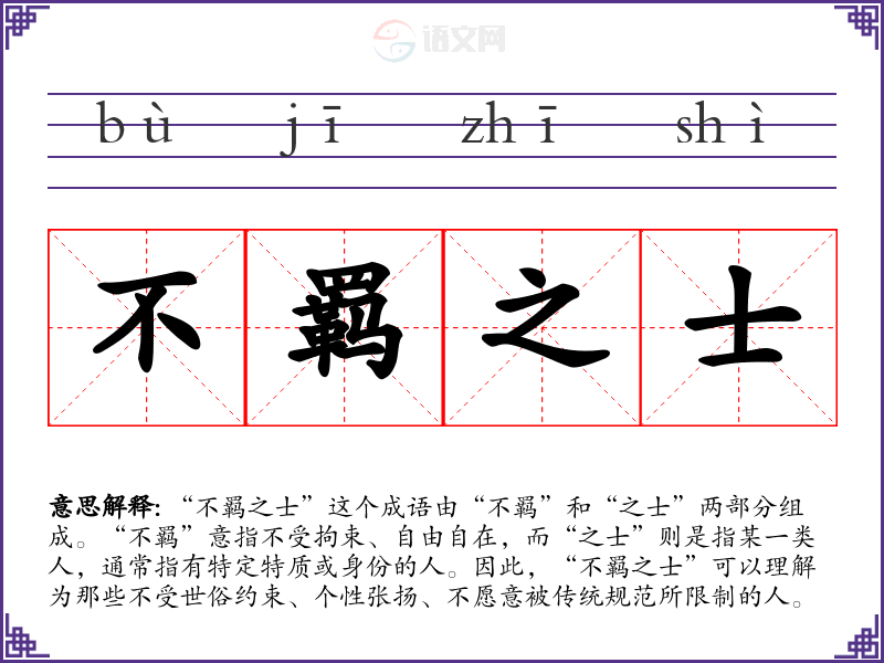 “不羁之士”这个成语由“不羁”和“之士”两部分组成。“不羁”意指不受拘束、自由自在,而“之士”则是指某一类人,通常指有特定特质或身份的人。因此,“不羁之士”可以理解为那些不受世俗约束、个性张扬、不愿意被传统规范所限制的人。
