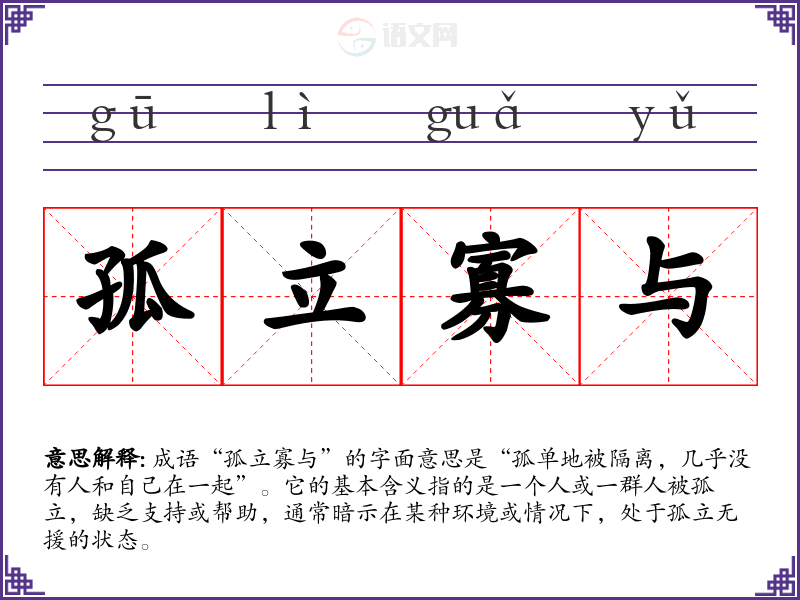 成语“孤立寡与”的字面意思是“孤单地被隔离,几乎没有人和自己在一起”。它的基本含义指的是一个人或一群人被孤立,缺乏支持或帮助,通常暗示在某种环境或情况下,处于孤立无援的状态。