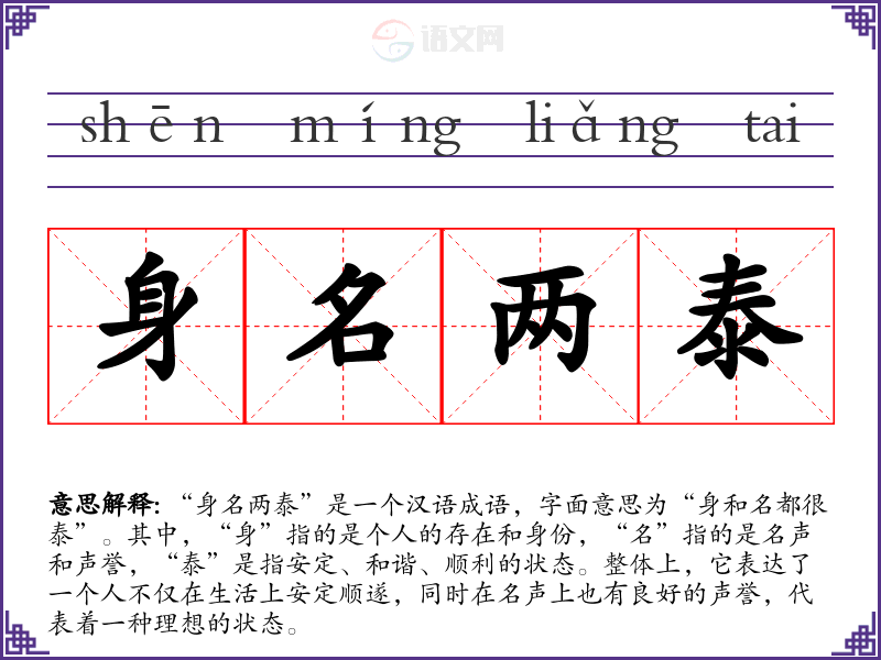 “身名两泰”是一个汉语成语,字面意思为“身和名都很泰”。其中,“身”指的是个人的存在和身份,“名”指的是名声和声誉,“泰”是指安定、和谐、顺利的状态。整体上,它表达了一个人不仅在生活上安定顺遂,同时在名声上也有良好的声誉,代表着一种理想的状态。