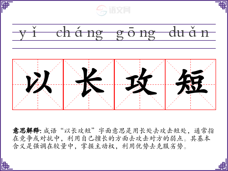 成语“以长攻短”字面意思是用长处去攻击短处,通常指在竞争或对抗中,利用自己擅长的方面去攻击对方的弱点。其基本含义是强调在较量中,掌握主动权,利用优势去克服劣势。
