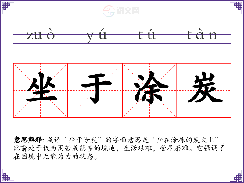 成语“坐于涂炭”的字面意思是“坐在涂抹的炭火上”,比喻处于极为困苦或悲惨的境地,生活艰难,受尽磨难。它强调了在困境中无能为力的状态。