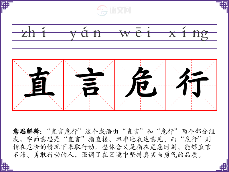“直言危行”这个成语由“直言”和“危行”两个部分组成。字面意思是“直言”指直接、坦率地表达意见,而“危行”则指在危险的情况下采取行动。整体含义是指在危急时刻,能够直言不讳、勇敢行动的人,强调了在困境中坚持真实与勇气的品质。