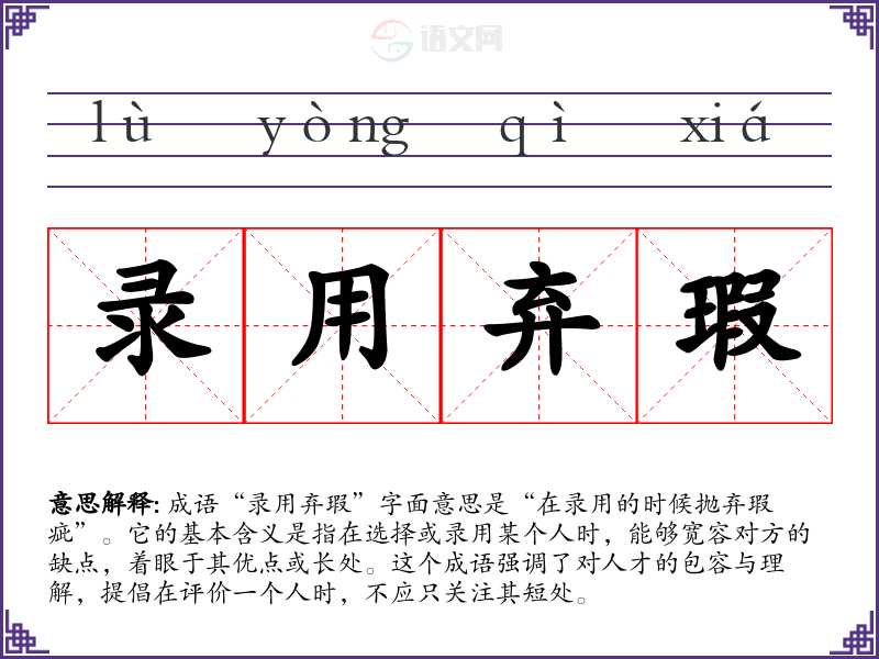 成语“录用弃瑕”字面意思是“在录用的时候抛弃瑕疵”。它的基本含义是指在选择或录用某个人时,能够宽容对方的缺点,着眼于其优点或长处。这个成语强调了对人才的包容与理解,提倡在评价一个人时,不应只关注其短处。