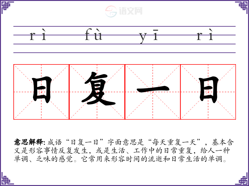 成语“日复一日”字面意思是“每天重复一天”,基本含义是形容事情反复发生,或是生活、工作中的日常重复,给人一种单调、乏味的感觉。它常用来形容时间的流逝和日常生活的单调。