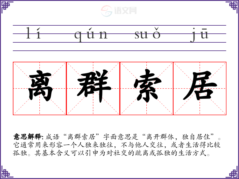 成语“离群索居”字面意思是“离开群体,独自居住”。它通常用来形容一个人独来独往,不与他人交往,或者生活得比较孤独。其基本含义可以引申为对社交的疏离或孤独的生活方式。
