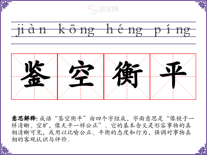 成语“鉴空衡平”由四个字组成,字面意思是“像镜子一样清晰、空旷,像天平一样公正”。它的基本含义是形容事物的真相清晰可见,或用以比喻公正、平衡的态度和行为,强调对事物真相的客观认识与评价。