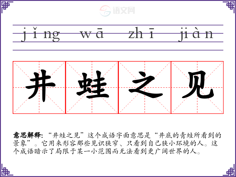 - 反义成语:开阔视野、见多识广。这些成语强调广泛的知识和见识,正好与“井蛙之见”形成对比。