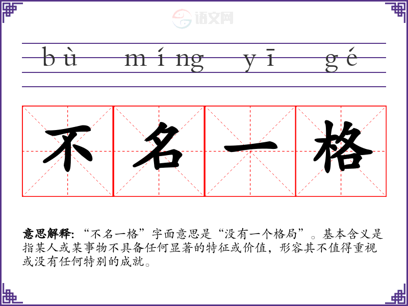 “不名一格”字面意思是“没有一个格局”。基本含义是指某人或某事物不具备任何显著的特征或价值,形容其不值得重视或没有任何特别的成就。