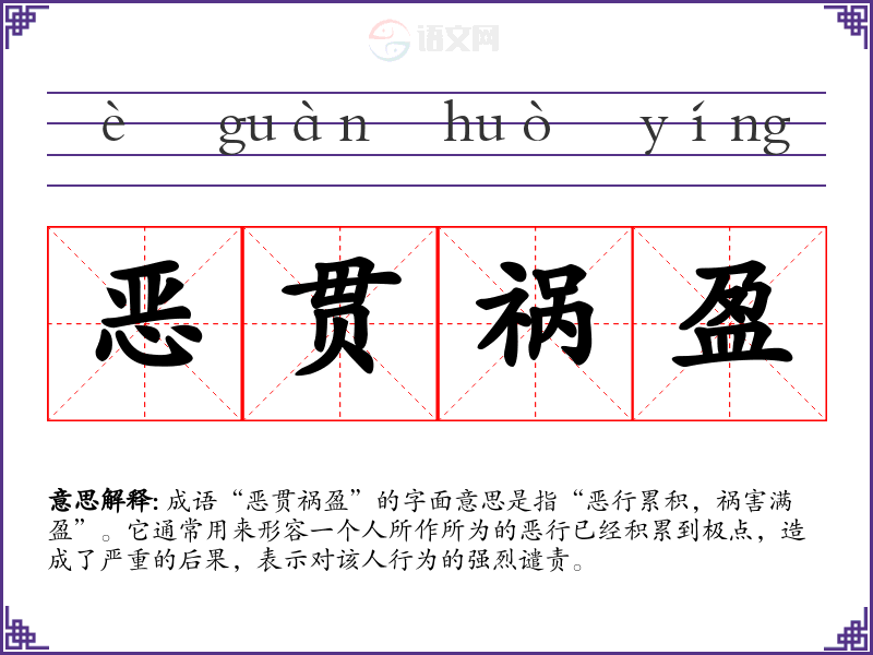 成语“恶贯祸盈”的字面意思是指“恶行累积,祸害满盈”。它通常用来形容一个人所作所为的恶行已经积累到极点,造成了严重的后果,表示对该人行为的强烈谴责。