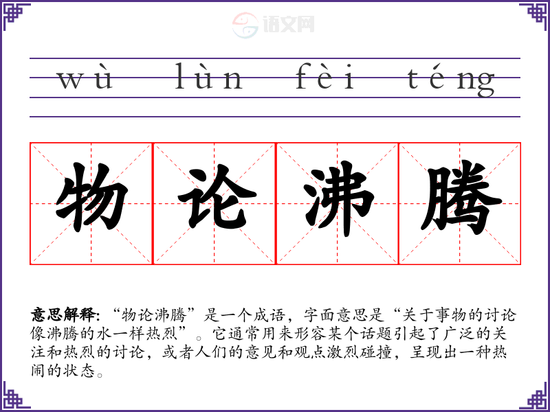 “物论沸腾”是一个成语,字面意思是“关于事物的讨论像沸腾的水一样热烈”。它通常用来形容某个话题引起了广泛的关注和热烈的讨论,或者人们的意见和观点激烈碰撞,呈现出一种热闹的状态。