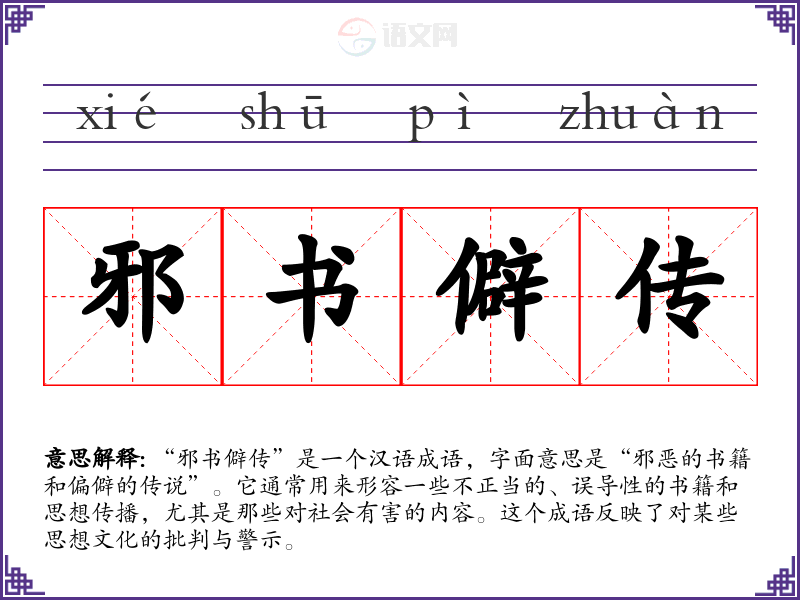 “邪书僻传”是一个汉语成语,字面意思是“邪恶的书籍和偏僻的传说”。它通常用来形容一些不正当的、误导性的书籍和思想传播,尤其是那些对社会有害的内容。这个成语反映了对某些思想文化的批判与警示。