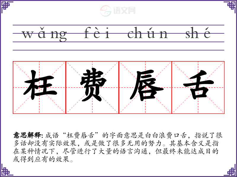 成语“枉费唇舌”的字面意思是白白浪费口舌,指说了很多话却没有实际效果,或是做了很多无用的努力。其基本含义是指在某种情况下,尽管进行了大量的语言沟通,但最终未能达成目的或得到应有的效果。