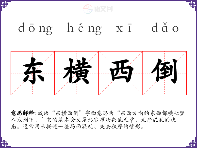 成语“东横西倒”字面意思为“东西方向的东西都横七竖八地倒下。”它的基本含义是形容事物杂乱无章、无序混乱的状态。通常用来描述一些场面混乱、失去秩序的情形。