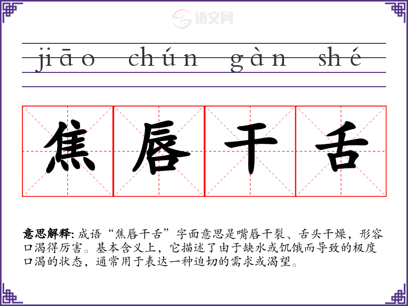 成语“焦唇干舌”字面意思是嘴唇干裂、舌头干燥,形容口渴得厉害。基本含义上,它描述了由于缺水或饥饿而导致的极度口渴的状态,通常用于表达一种迫切的需求或渴望。