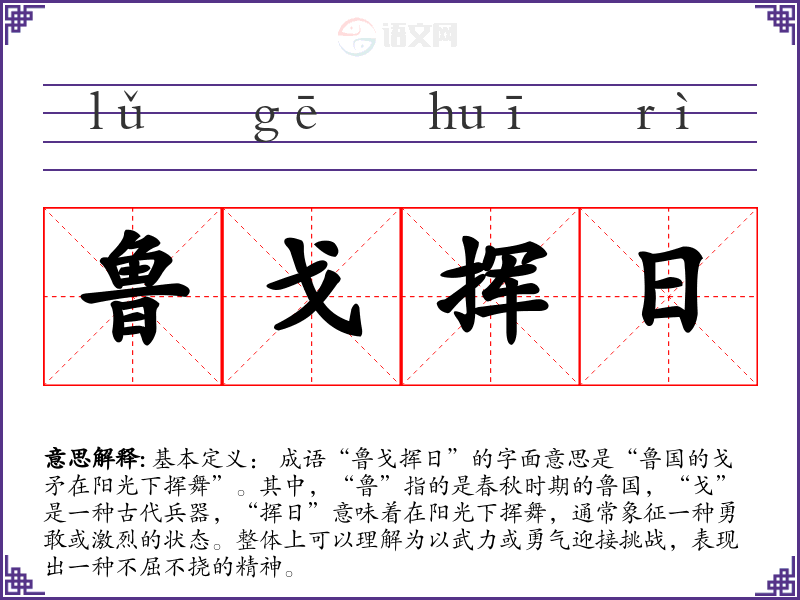 基本定义: 成语“鲁戈挥日”的字面意思是“鲁国的戈矛在阳光下挥舞”。其中,“鲁”指的是春秋时期的鲁国,“戈”是一种古代兵器,“挥日”意味着在阳光下挥舞,通常象征一种勇敢或激烈的状态。整体上可以理解为以武力或勇气迎接挑战,表现出一种不屈不挠的精神。