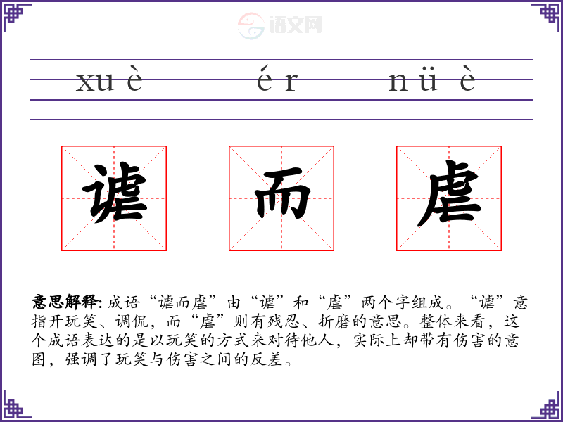 成语“谑而虐”由“谑”和“虐”两个字组成。“谑”意指开玩笑、调侃,而“虐”则有残忍、折磨的意思。整体来看,这个成语表达的是以玩笑的方式来对待他人,实际上却带有伤害的意图,强调了玩笑与伤害之间的反差。