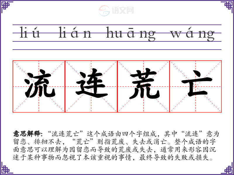 “流连荒亡”这个成语由四个字组成,其中“流连”意为留恋、徘徊不去,“荒亡”则指荒废、失去或消亡。整个成语的字面意思可以理解为因留恋而导致的荒废或失去,通常用来形容因沉迷于某种事物而忽视了本该重视的事情,最终导致的失败或损失。